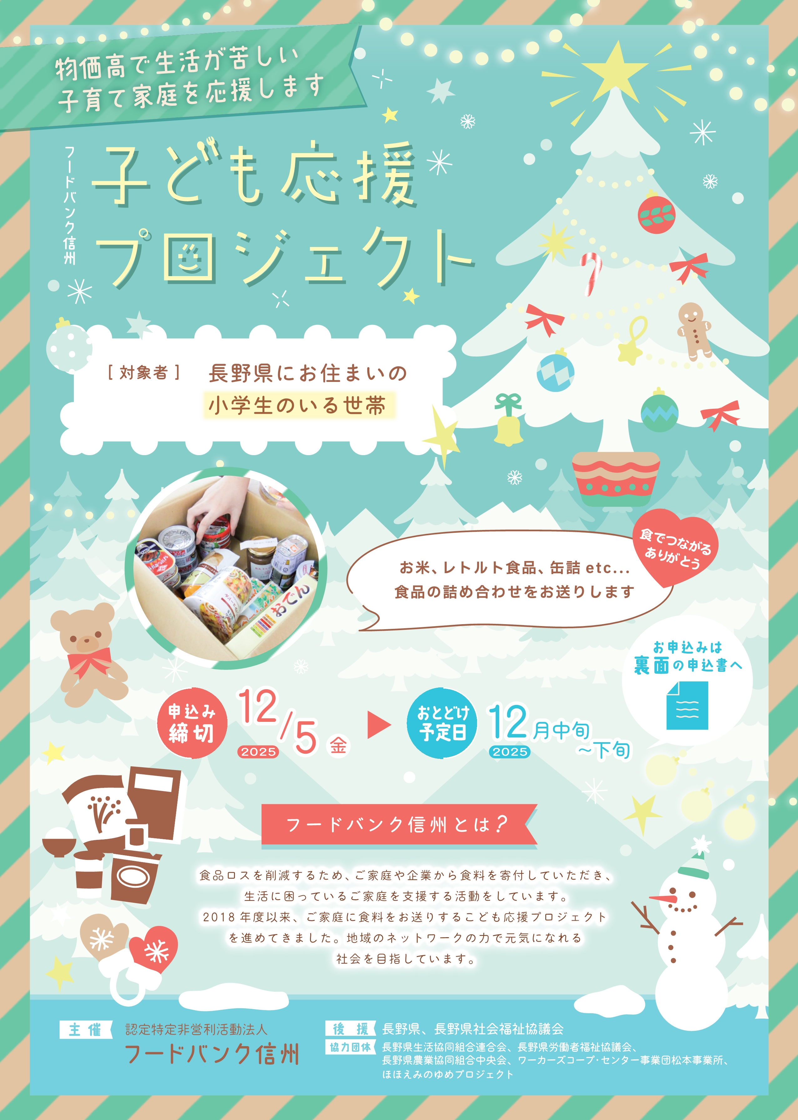 フードバンク信州では、食料品などの物価高で生活が苦しい子育て家庭を食料で応援する「子ども応援プロジェクト」を実施します。