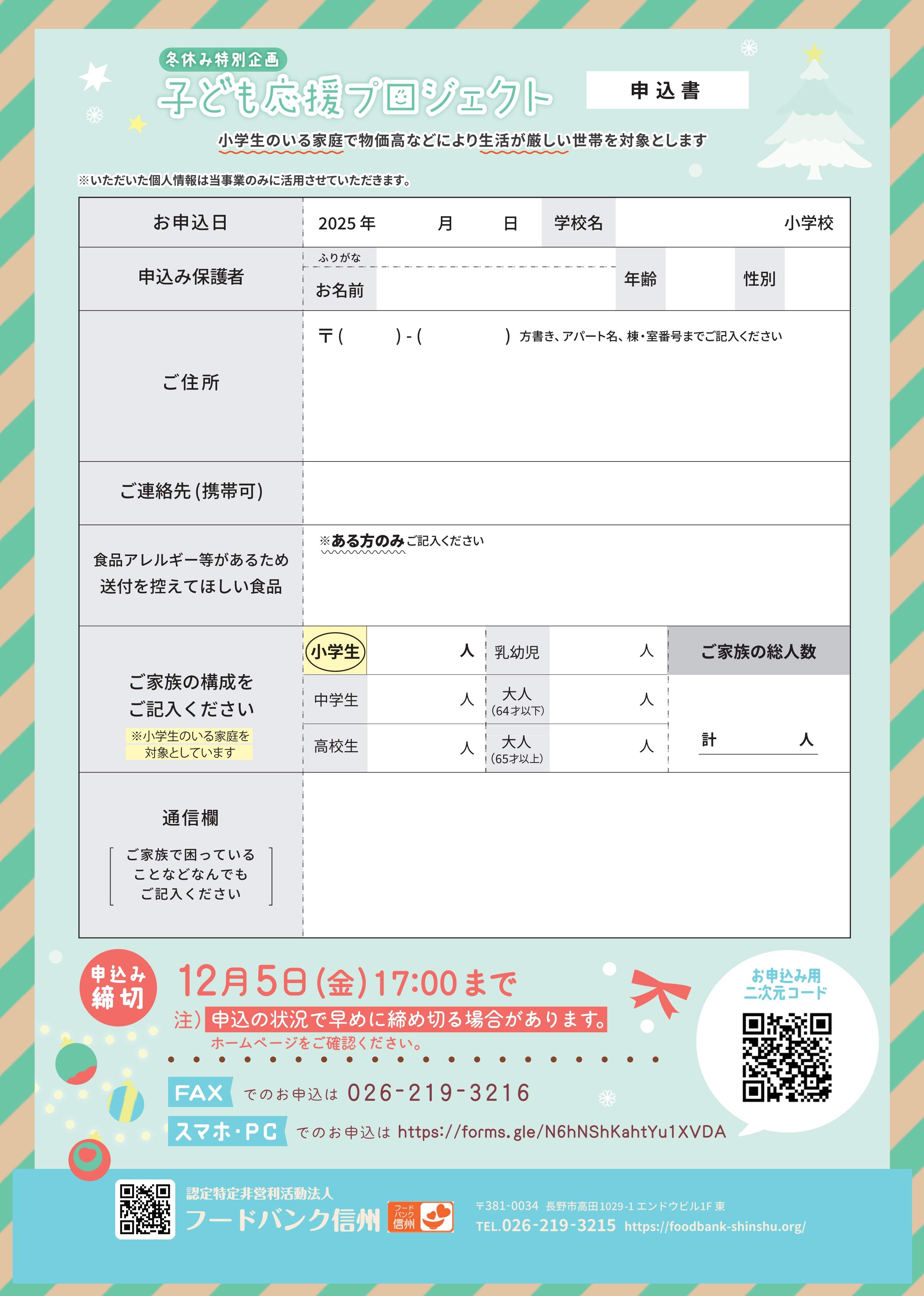 長野県内に居住されており、小学生のいる家庭で物価高などにより生活が厳しい世帯で、食料提供を希望される方は別添申込書でお申し込みください。